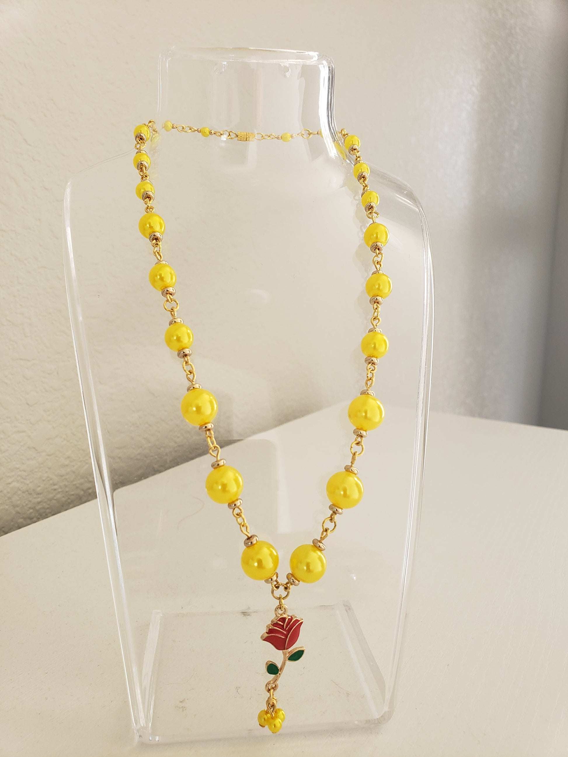 BellaRose1 Lemon Yellow "Pearl" Beads w/ Enamel Red Rose Charm 16.75" Necklace