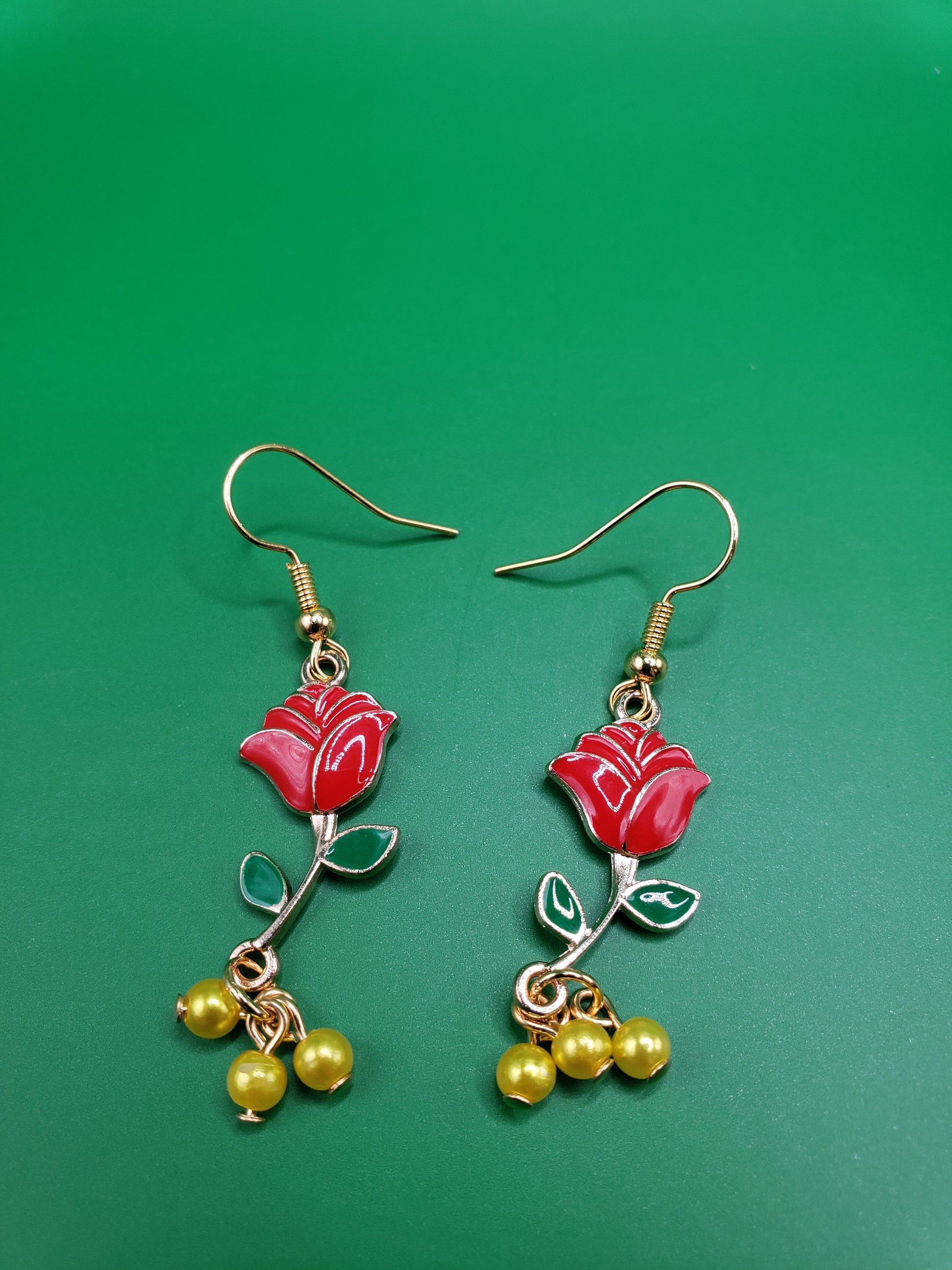 BellaRose2 Enamel Red Rose Charm with Lemon Yellow "Pearl" Dangling Beads 1.25" Earrings