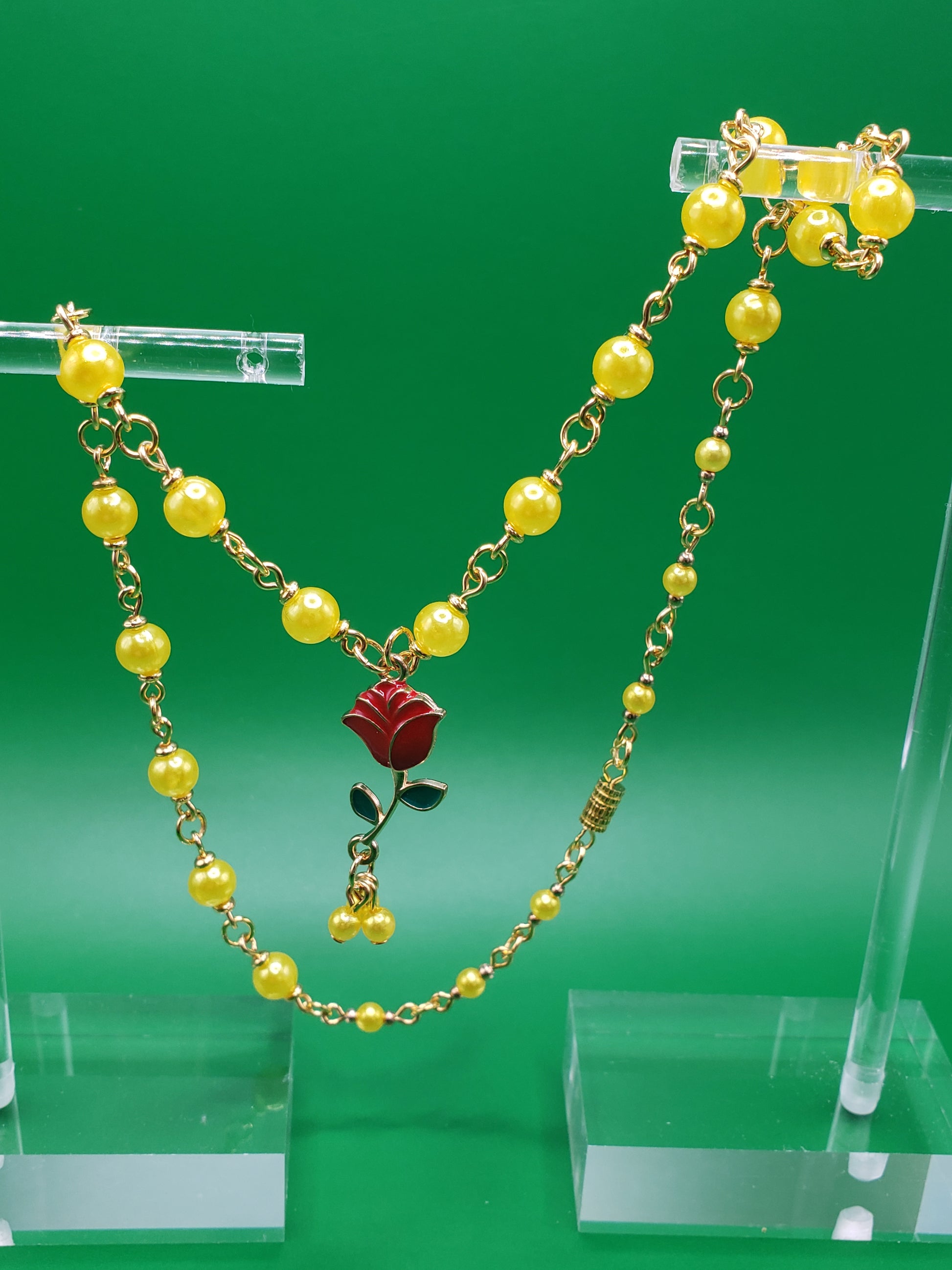 BellaRose2 Lemon Yellow "Pearl" Beads w/ Enamel Red Rose Charm 16" Necklace