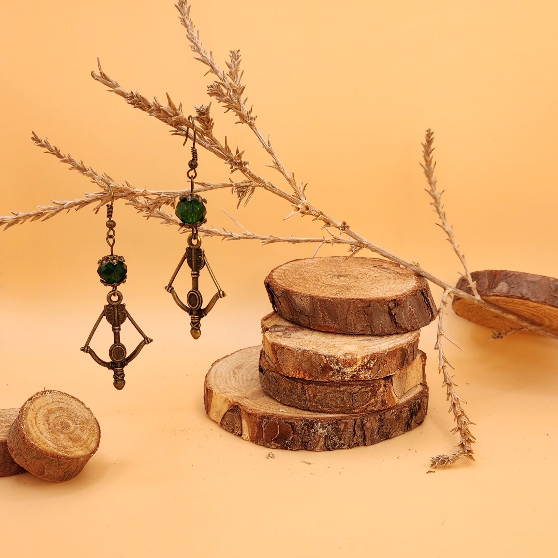 ArcherLass2 Bronze Colored & Emerald Faceted Glass 2.5" x 1" Bow & Arrow Drop Earring